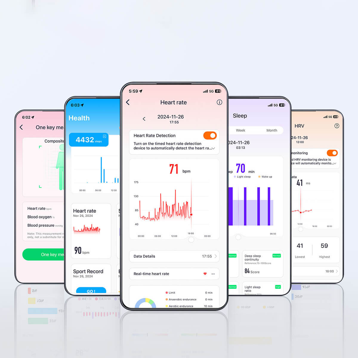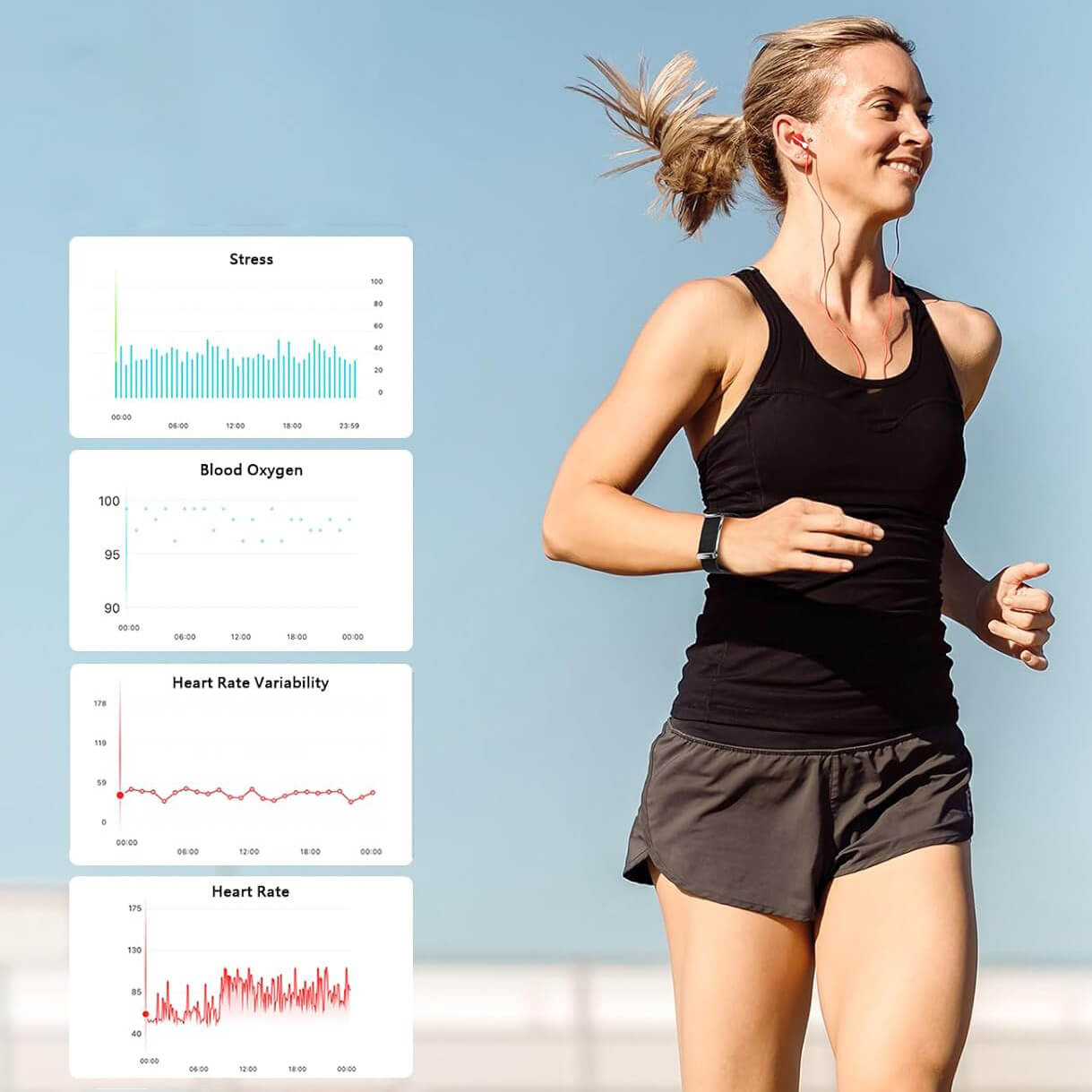 24/7 gezondheidsbewaking: hartslag, SpO₂, stress, HRV en slaapanalyse.